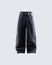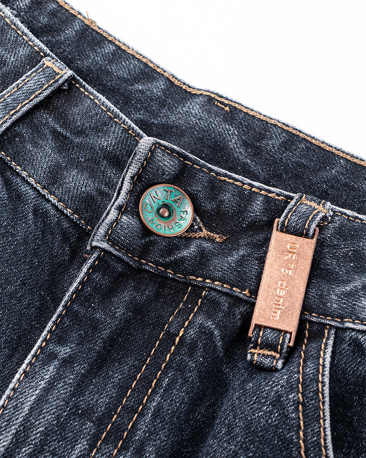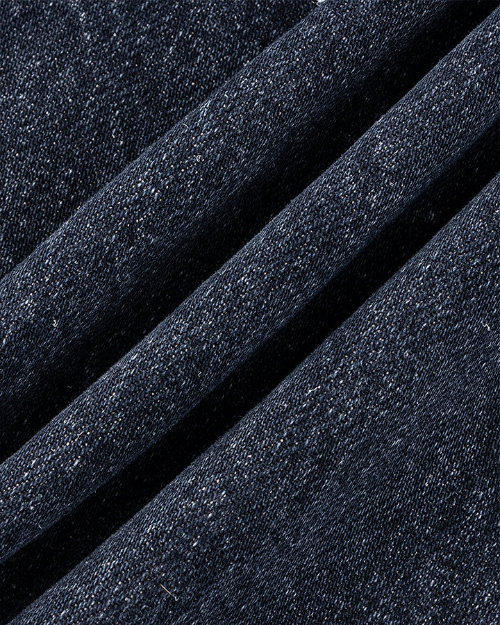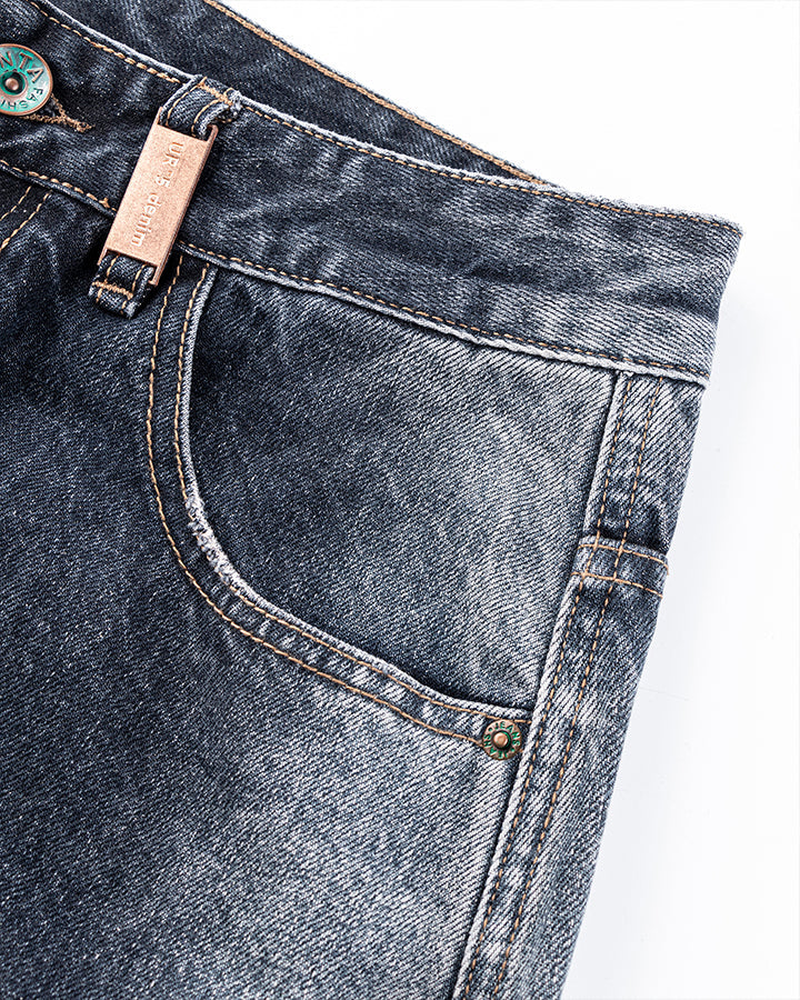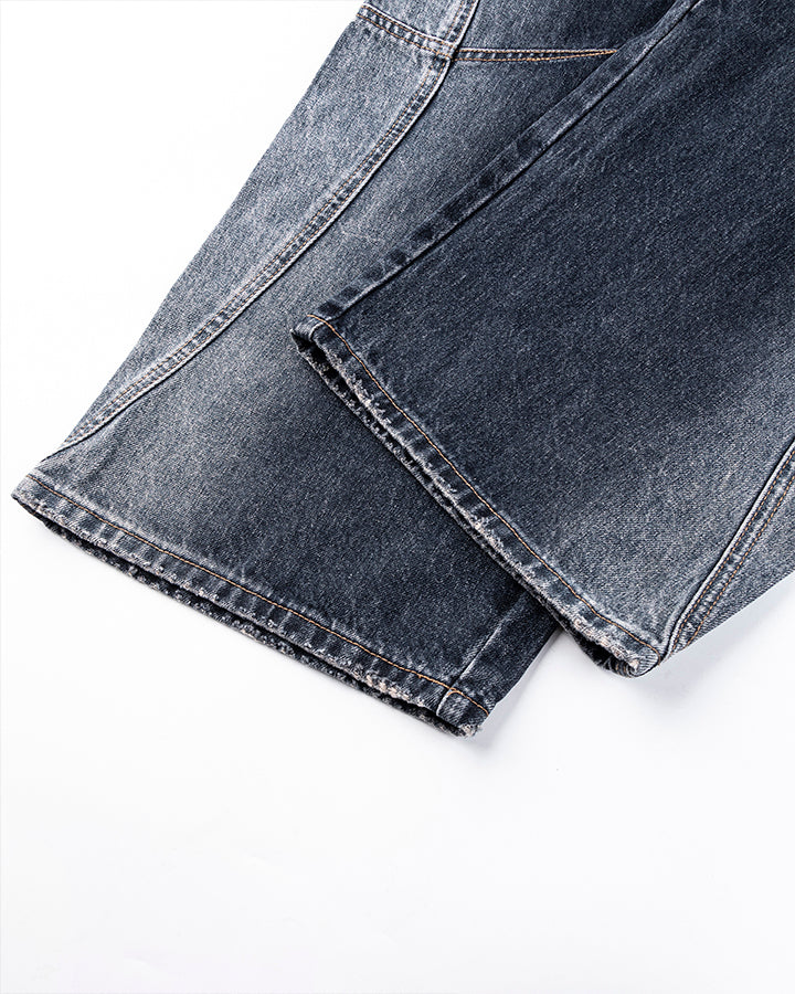 Washed denim texture, wide-leg silhouette, classic five-pocket design, contrast stitching, minimal distressed style
