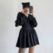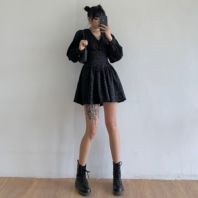 DESCRIPTION Watch out for traditional Japanese looks. draped styles and unconventional detailing in Tekkawear's dress collection. This black polyesterseparation femme dress from Tekkawearfeatures av-neck.long sleeves and a puffy sleeves. |