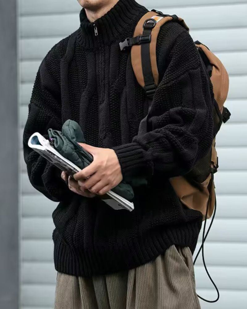 This Chunky Cable-Knit Retro Turtleneck Sweater blends timeless texture with modern comfort. Its prominent cable pattern and soft. thick fabric offer both warmth and style. The versatile half-zip neck allows adjustable coverage. perfect for layering. With a relaxed. cozy fit and vintage-inspired design. this piece adds rustic charm to any casual or smart-casual look. Ideal for cool days. it's a go-to sweater that combines function. comfort. and enduring appeal.