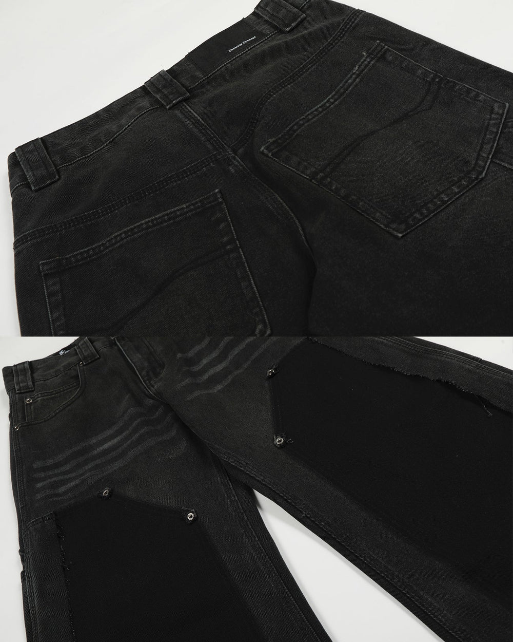 Washed texture, panel structure, wide-leg silhouette, multi-seam detailing, unique asymmetrical design